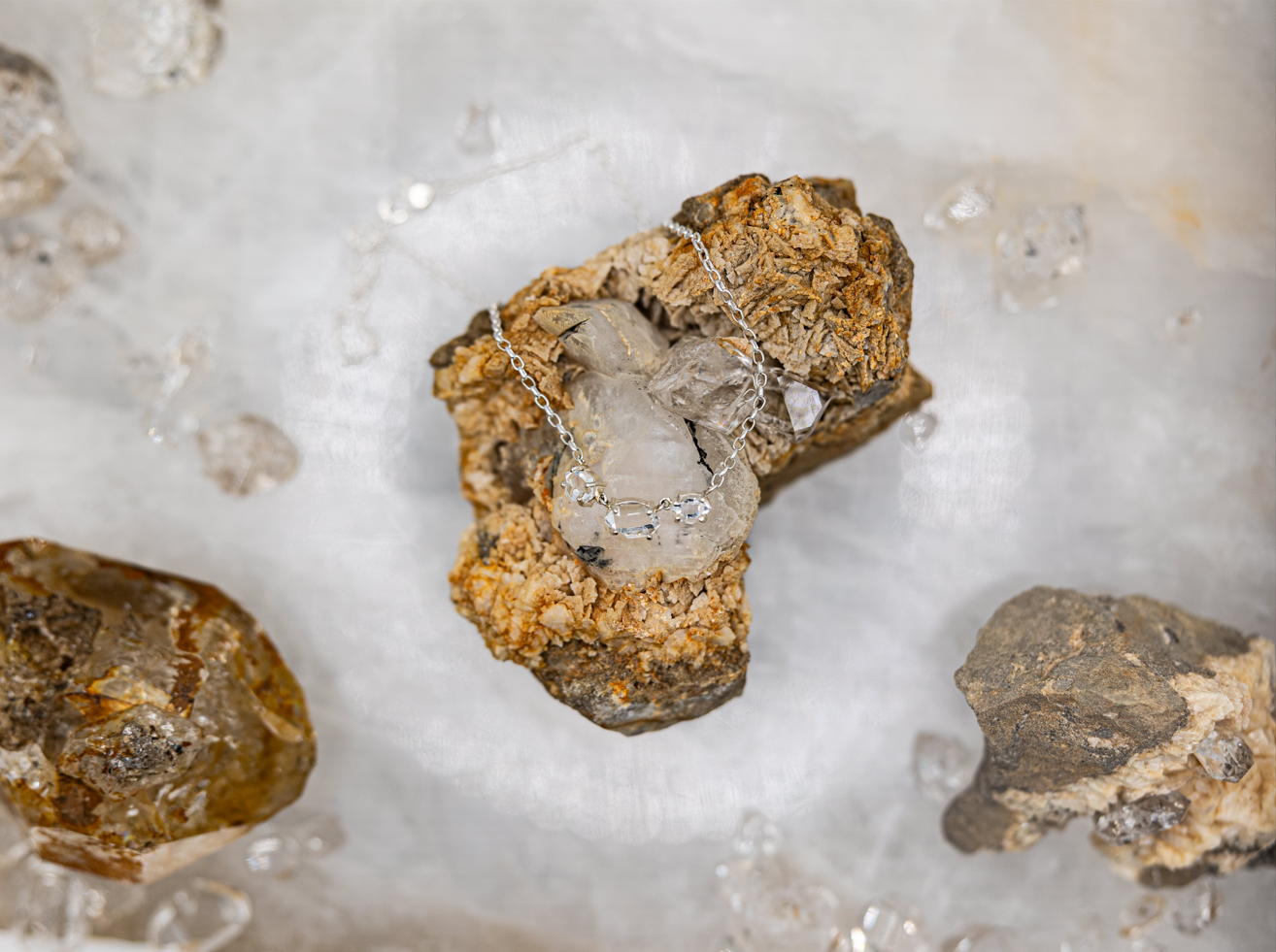 Delicate and refined, this necklace features three natural genuine Herkimer diamonds set on an 18” sterling silver chain. A minimalist design with subtle sparkle-perfect for bridal, layering, or everyday elegance.