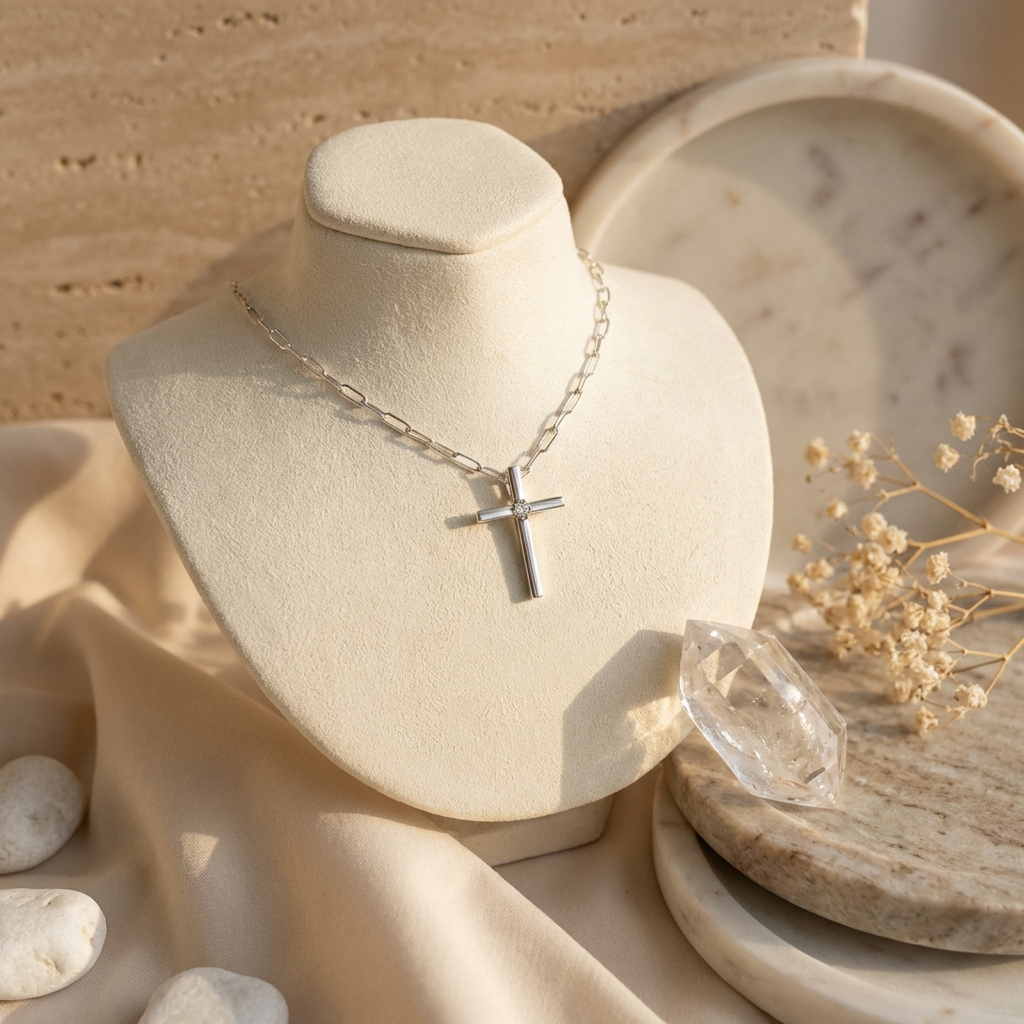 A timeless symbol of faith and light, this necklace features a radiant Herkimer diamond set at the heart of a polished cross pendant. The crystal’s natural clarity reflects strength, purity, and divine connection — making it a meaningful piece for everyday wear or gifting.