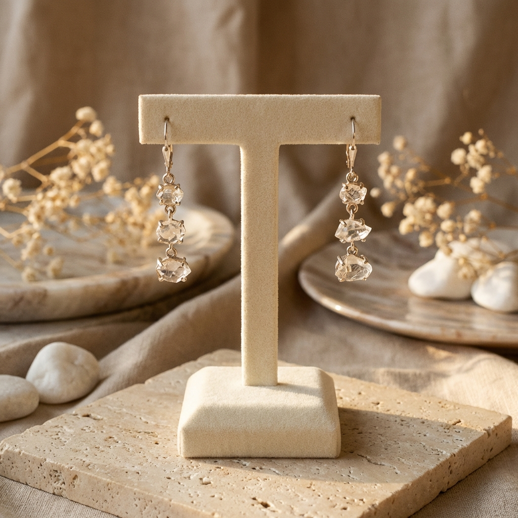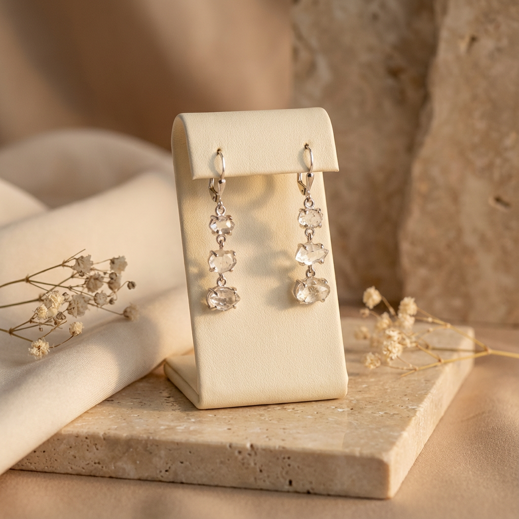 These elegant chandelier-style earrings feature three natural Herkimer Diamonds suspended in a vertical cascade of light. Each raw double-terminated crystal is hand-set in sterling silver, creating a fluid line of sparkle that moves beautifully with you.